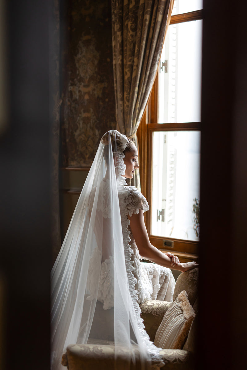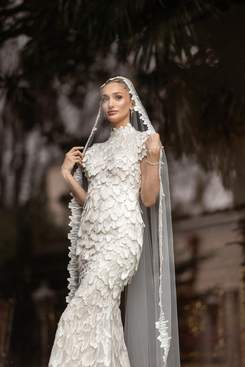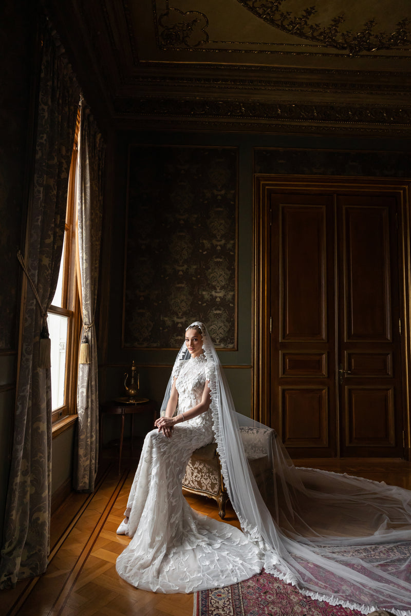 Le Roman de la Rose’a romantik bir saygı duruşu niteliğindeki son gelin tasarımımızı tanıtıyoruz. Bu zarif gelinlik, yumuşak krem renginde otantik organik pamuklu dantel ve lüks tafta ile rustik çekiciliği zamansız bir tasarımla harmanlıyor. Etek, ortaçağdan ilham alan drapeli tutturmalar ve gotik bağlarla öne çıkıyor. Bütünde dramatik, hacimli bir balon şekli yaratırken, uzun fiyonk kuyrukları sayesinde narin bir dokunuş katıyor. Romantizm ve cesur duruşun mükemmel dengesini arayan bu parça, kendine has, vintage cazibesiyle bir peri masalı hayal eden gelinler için.